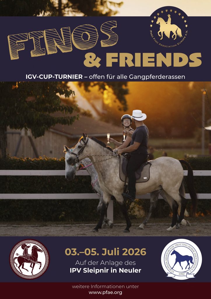 Die Paso Fino Association Europe e. V. (PFAE) und die Internationale Gangpferdevereinigung e. V. (IGV) richten im kommenden Jahr ein gemeinsames Turnier aus. Vom 3. bis 5. Juli 2026 sind alle Gangpferdereiterinnen und -reiter herzlich eingeladen, auf der Anlage des IPV Sleipnir in Neuler an einem vielfältigen Prüfungsangebot teilzunehmen.